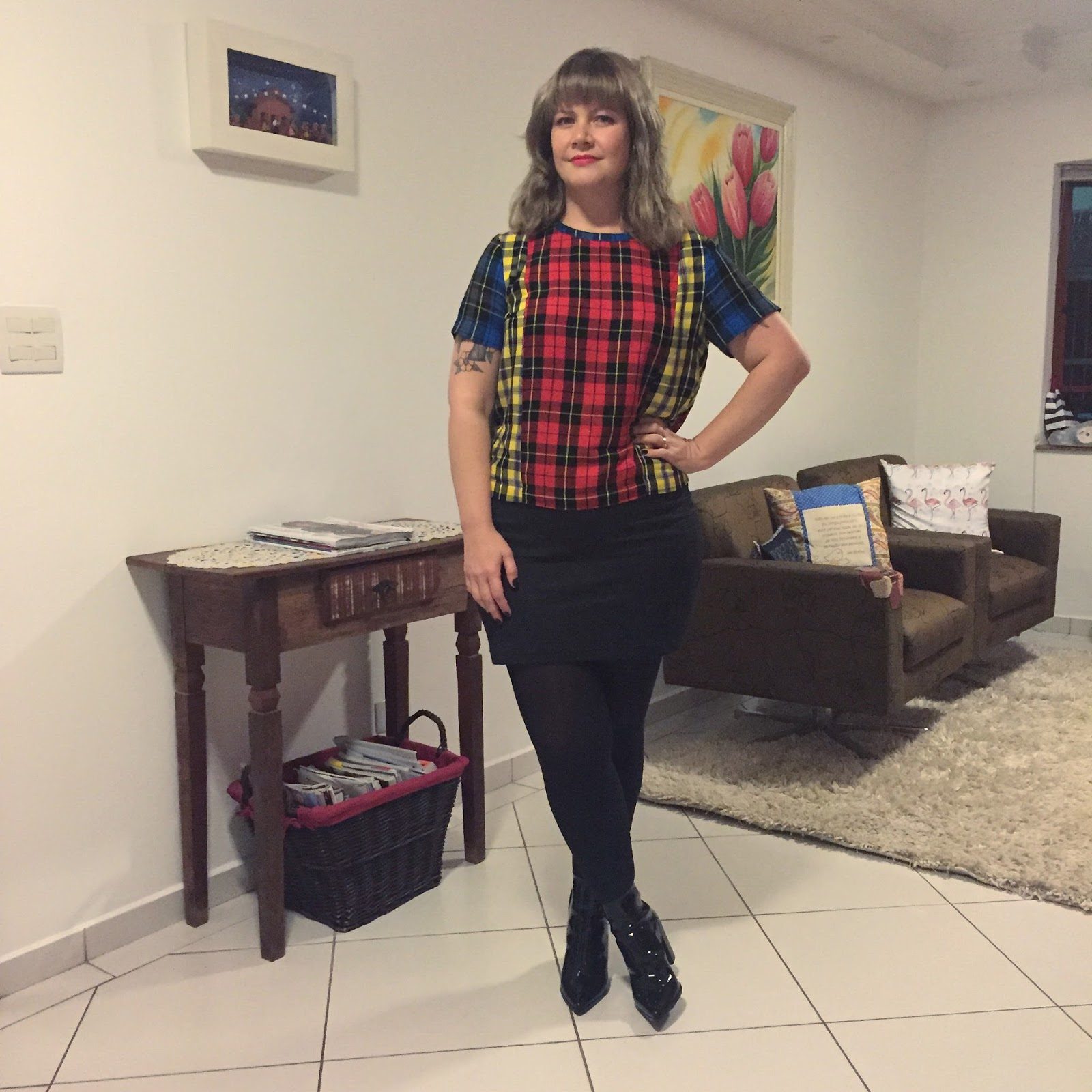 Confesso que gosto mais de usar uma saia ou um vestido com meia calça mais grossinha e botas do que usar calças no frio. Esta mini saia foi usada nos últimos dias mais quentes e já está sendo bem útil agora no frio. Outras saias que tenho serão usadas da mesma forma.