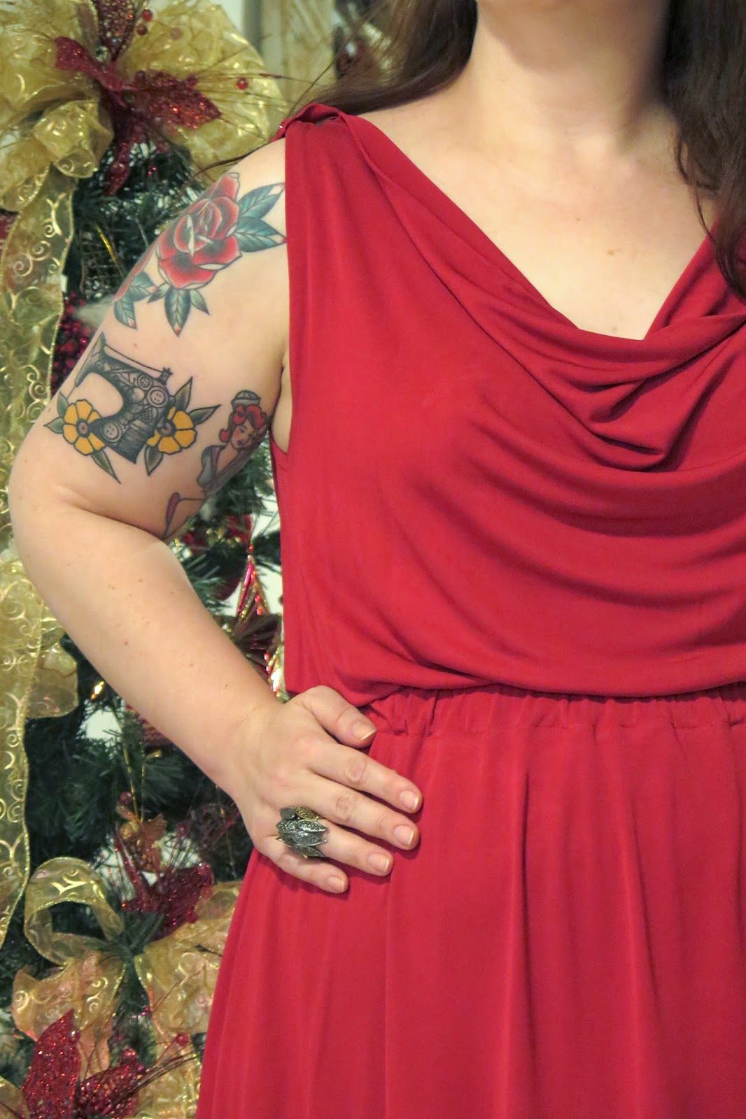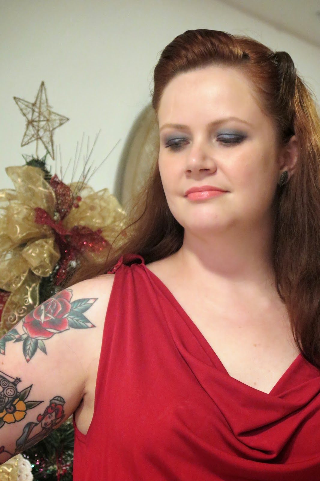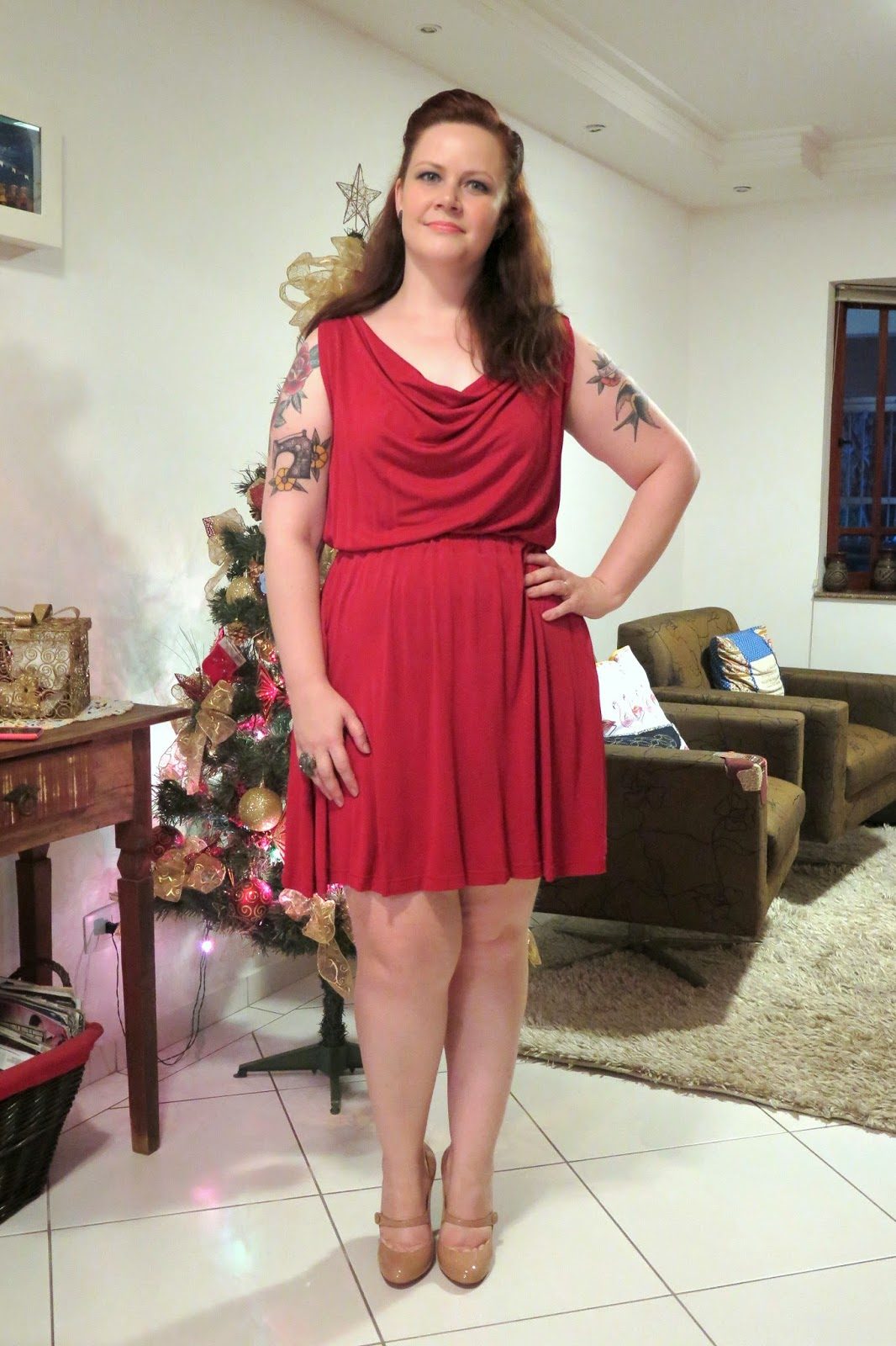 O primeiro look natalino acabou sendo um reflexo disso tudo. Vestido que eu adoro, que tem um jeitinho mais arrumado. Acessórios que ganhei do marido e que estão sendo usados direto. Sapatos de sonho que não me serviram por um ano inteiro porque meus pés viviam inchados (verão sem pés inchados, te amo!), cabelo curinga que sempre faço para “destampar” o rosto (como fazer aqui), maquiagem inspirada neste vídeo da mais que querida Julia Petit (com quem aprendi praticamente tudo o que sei do assunto). Tudo fácil e à mão.