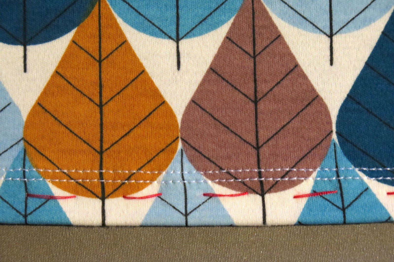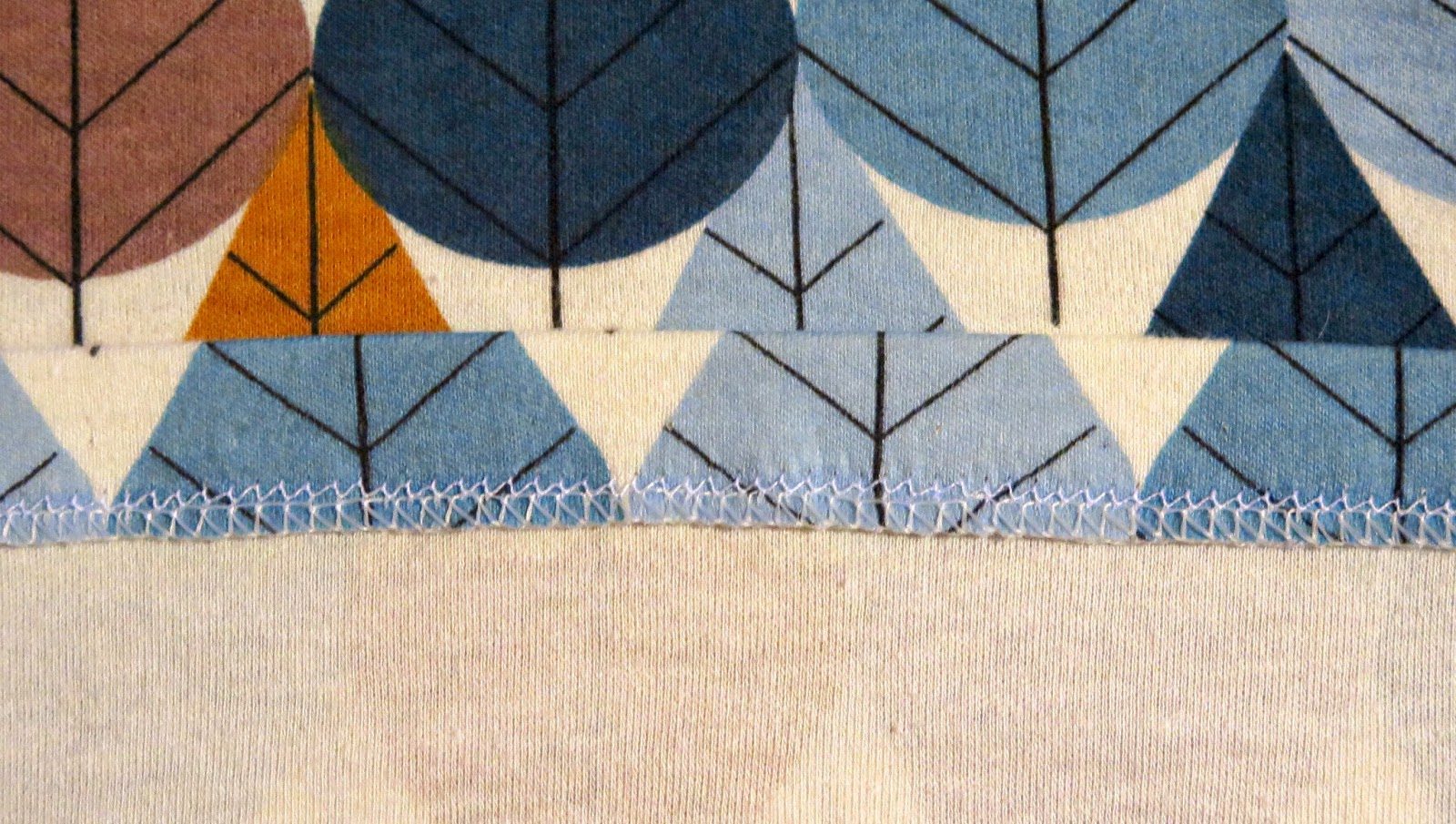 Barra virada para cima, para mostrar como fica por dentro. O overloque está bem na beiradinha abaixo e o ziguezague estreito acima é resultado da costura com agulha dupla.