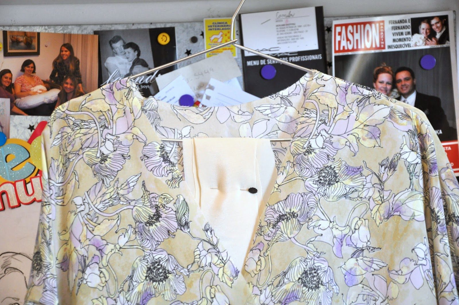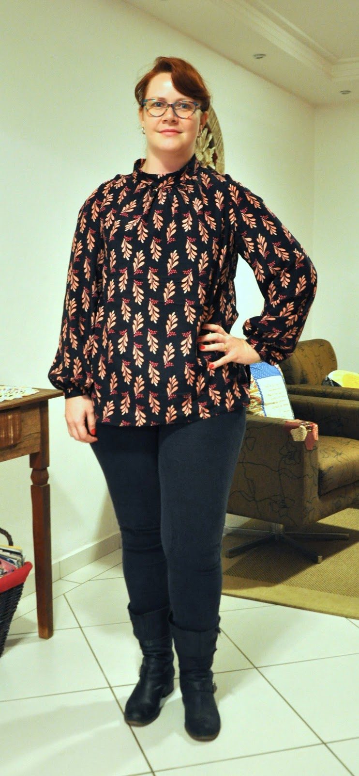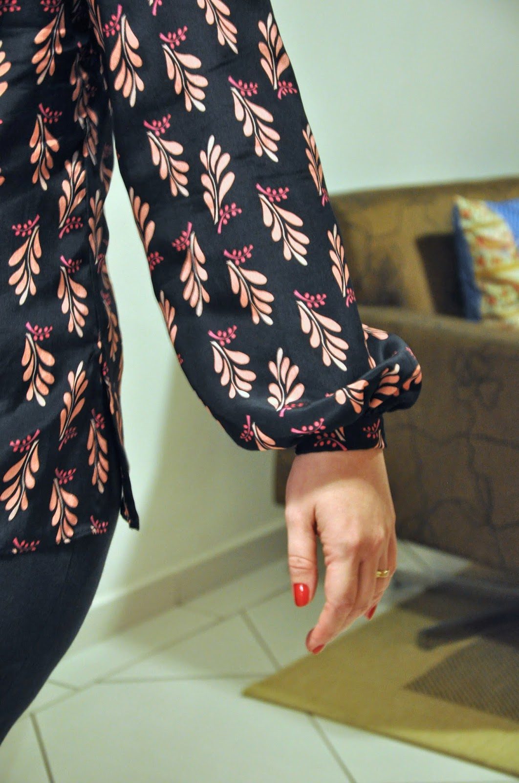 Eu tenho três blusas deste modelo, mas não sei por que esta é a que uso menos. Por isso fiquei feliz com a combinação, já que deixou mais uma possibilidade de usá-la. Adoro as mangas em godê que dão movimento e o acabamento em viés com pontos invisíveis à mão. Vendo as fotos, a estampa de pêras alinhadinhas acabou também dando um efeito gráfico bem interessante!