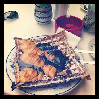 Kauf Dich Glücklich: O melhor waffle do mundo, em mais um dos lugares em que nada é igual (note as cadeiras e mesas) mas tudo combina!