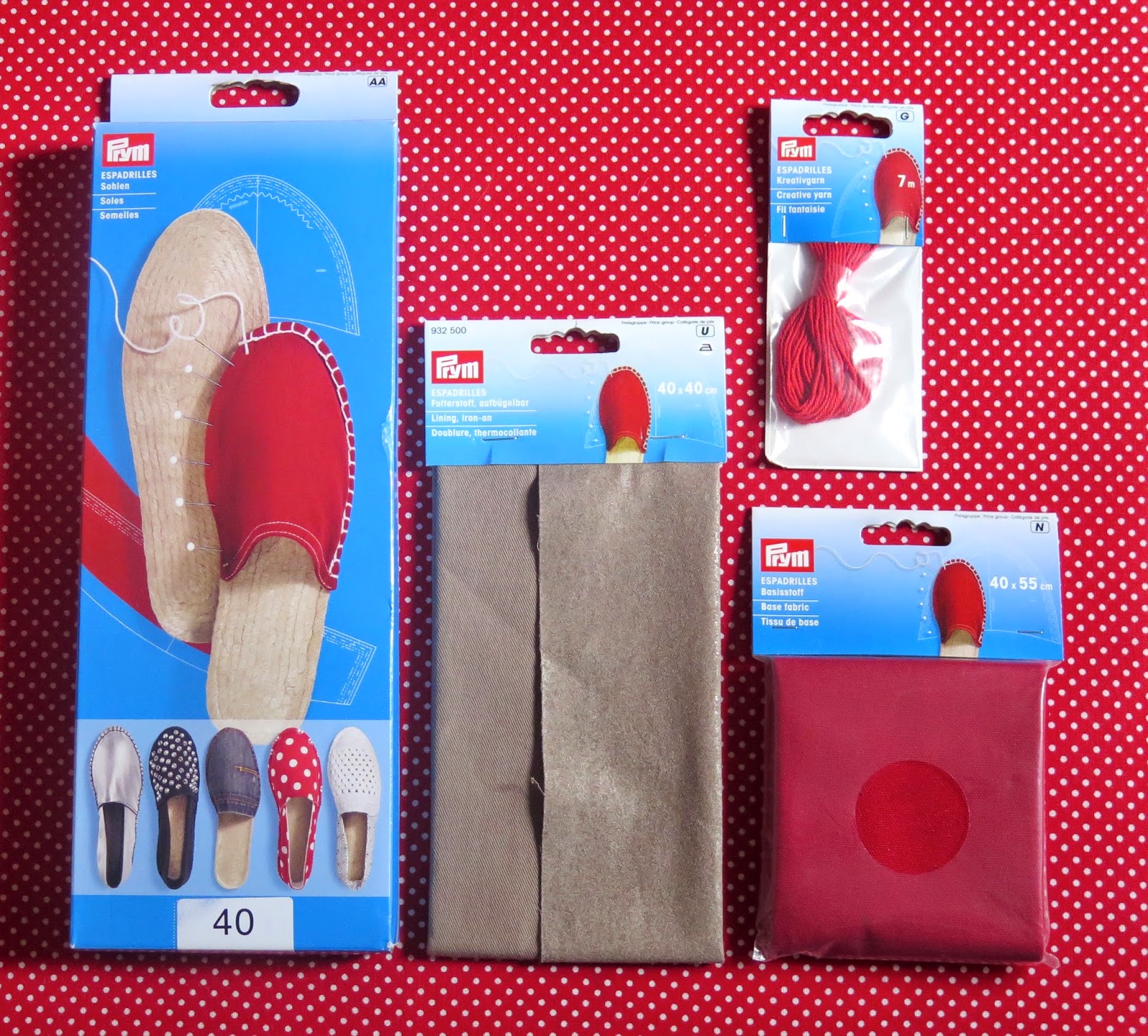 Os produtos eram vendidos separadamente, mas estavam todos juntinhos na loja onde comprei (na Galeria Kaufhof): solado de corda com base em borracha, tecido externo (tinham algumas cores para escolher, fiquei com o vermelho), tecido termocolante para o forro, linha para o caseado manual.