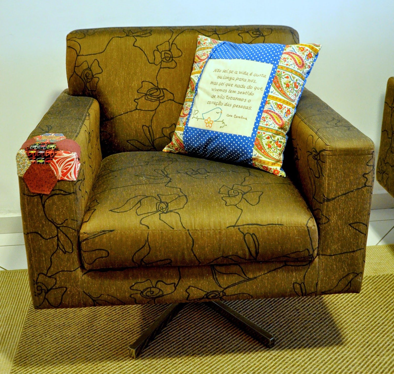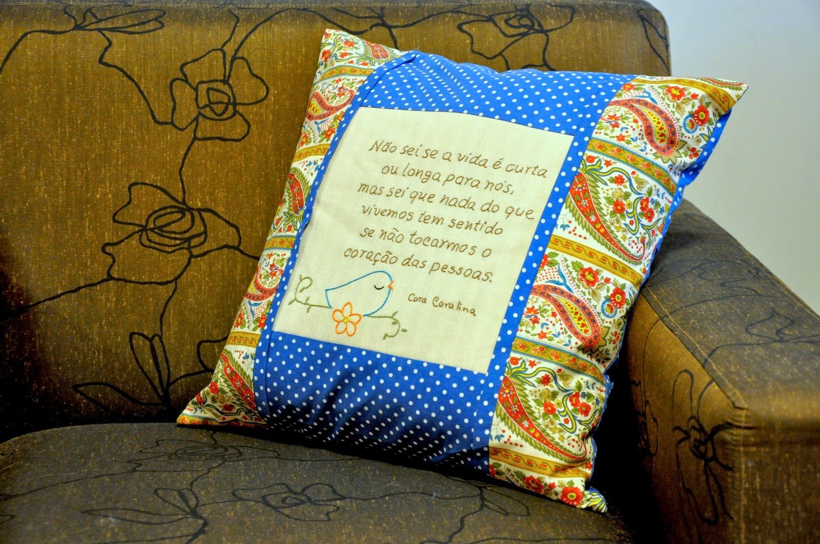 O painel (que eu terminei de bordar rapidinho em casa) acabou virando… adivinha? Uma almofada!