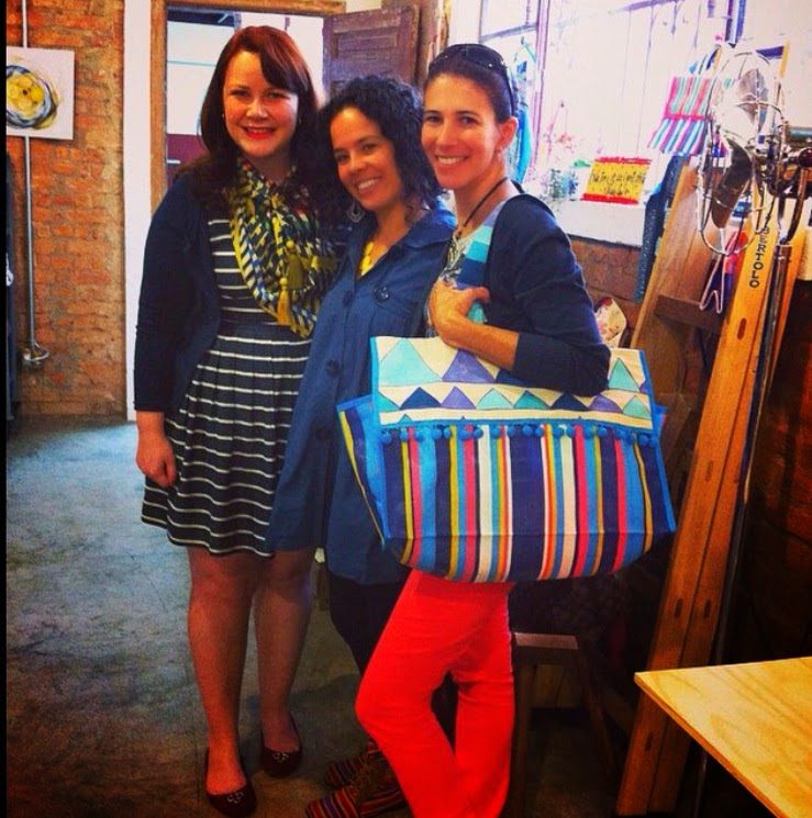 Eu (de lenço novo, vestido listrado azul e branco da Maria Filó para a C&A que eu amo, casaquinho marinho e sapatilha cor de uva), Bianca Rego e Andrea Risério, muito queridas!