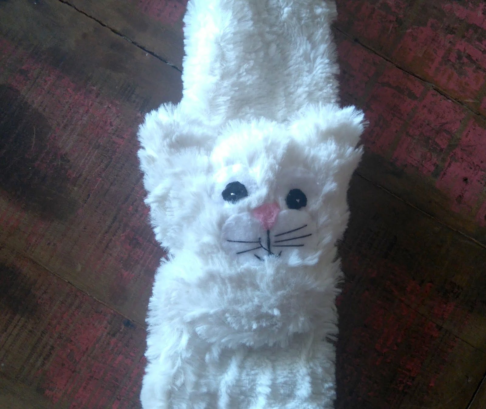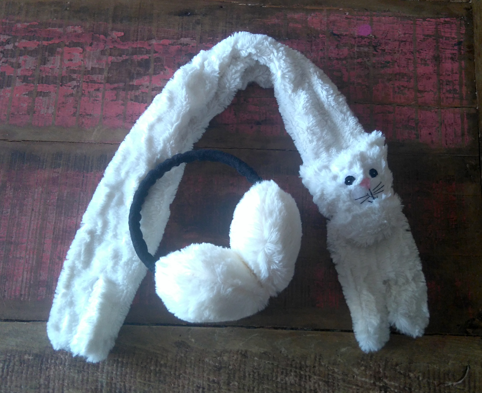 Ela me contou que havia herdado um tecido peludo da minha madrinha (isso frequentemente acontece aqui em casa, visto que somos todas costureiras) e não sabia o que fazer com ele. Eis que surgiu uma idéia: um cachecol de gatinho, com todos os detalhes do bichano e ainda um passador para prendê-lo no pescoço.