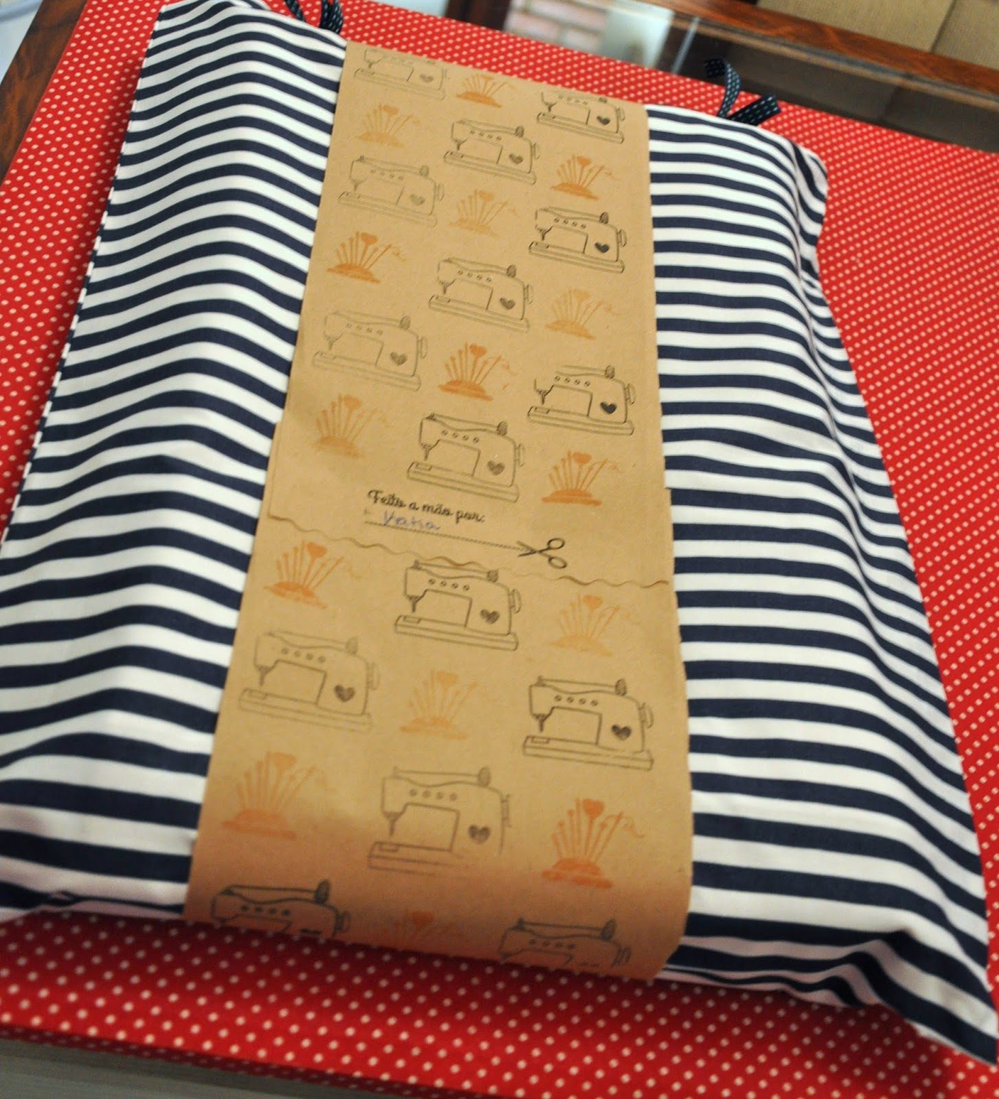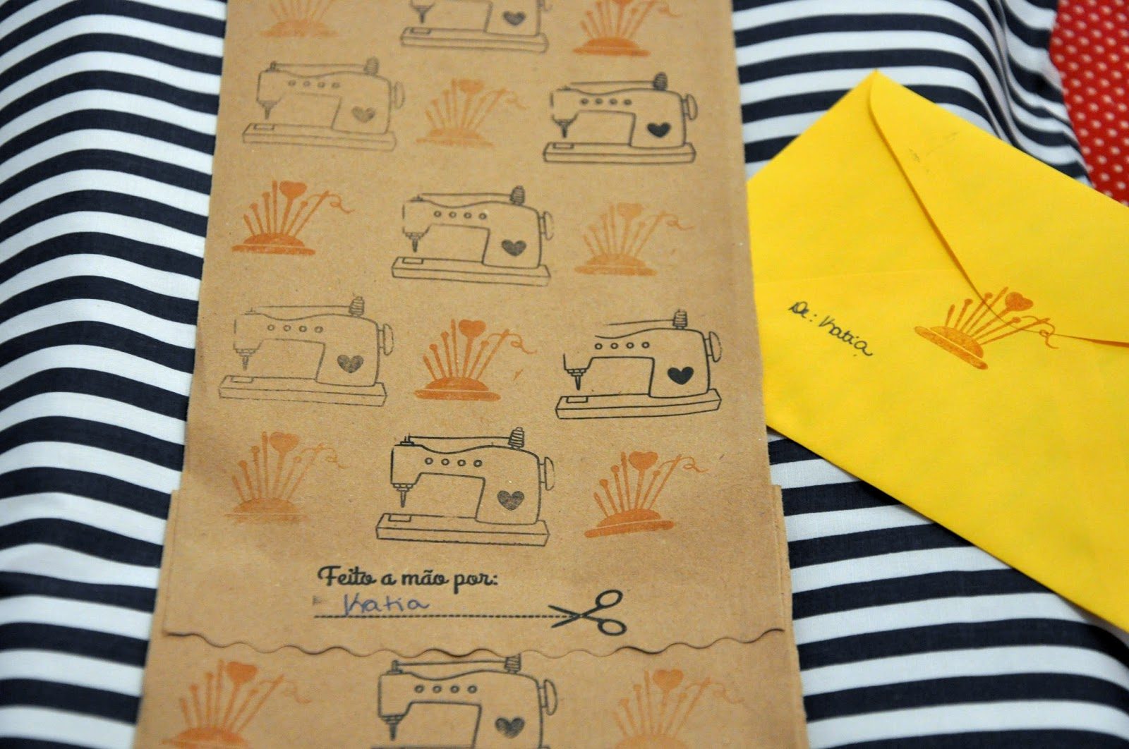 Fiz um saquinho em tecido listrado e coloquei fitas decoradas com pespontos para amarrar na abertura. Para deixar com cara de presente, um cartão que seguiu dentro do pacote e por fora uma faixa de papel craft toda carimbada (estou viciada nesses carimbos, rs!)