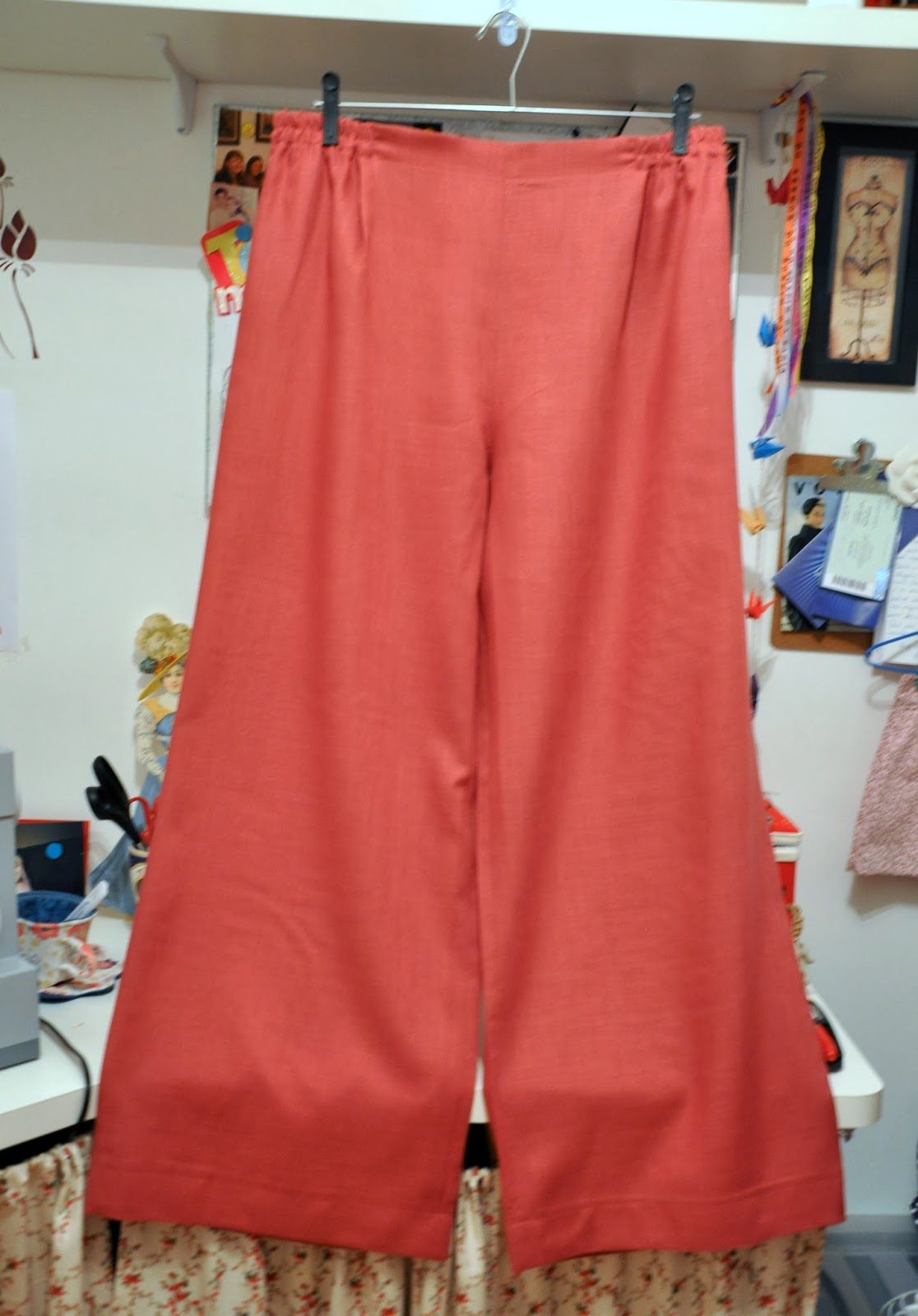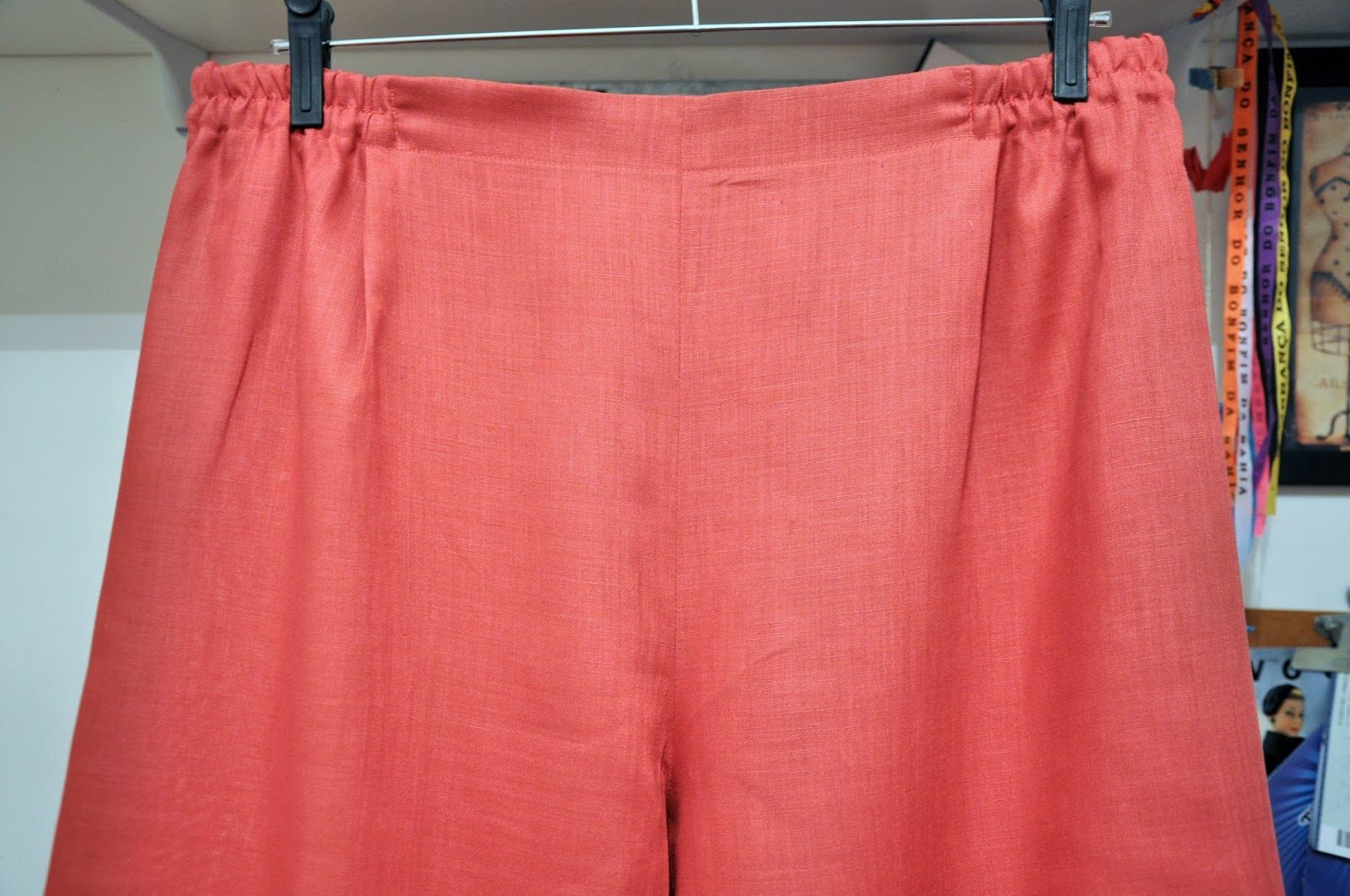 Feliz por ter terminado o vestido, retomei a pantalona de linho. Estava receosa quanto ao cós, pois não estava funcionando conforme o molde que usei para fazer a peça em malha. Alguns ajustes e provas depois (além de muuuuuuuitos fiapos de linho por todo o quartinho), a calça também ficou pronta!
