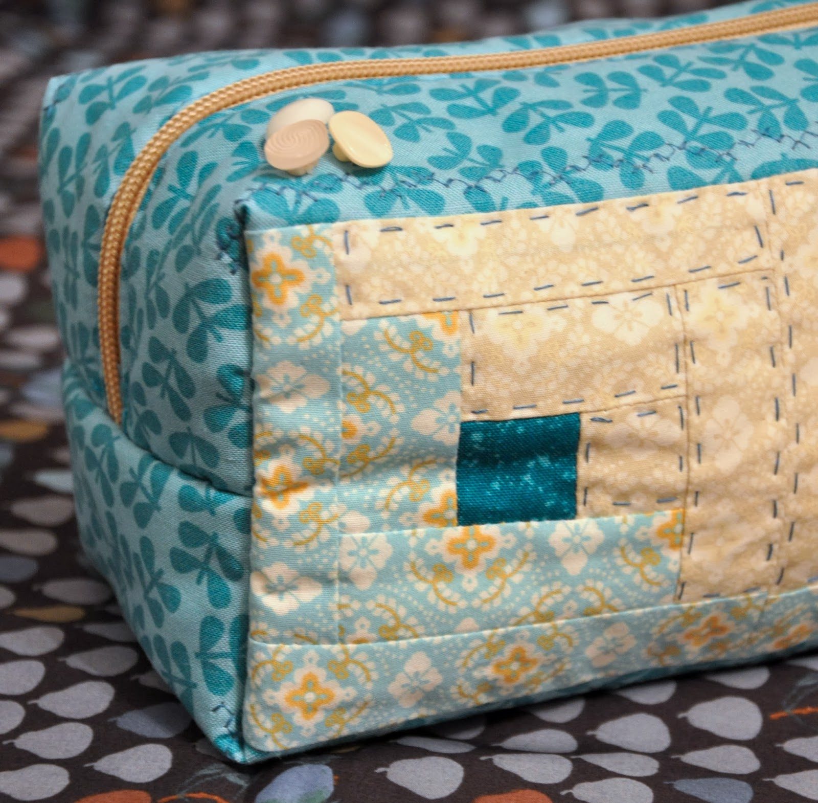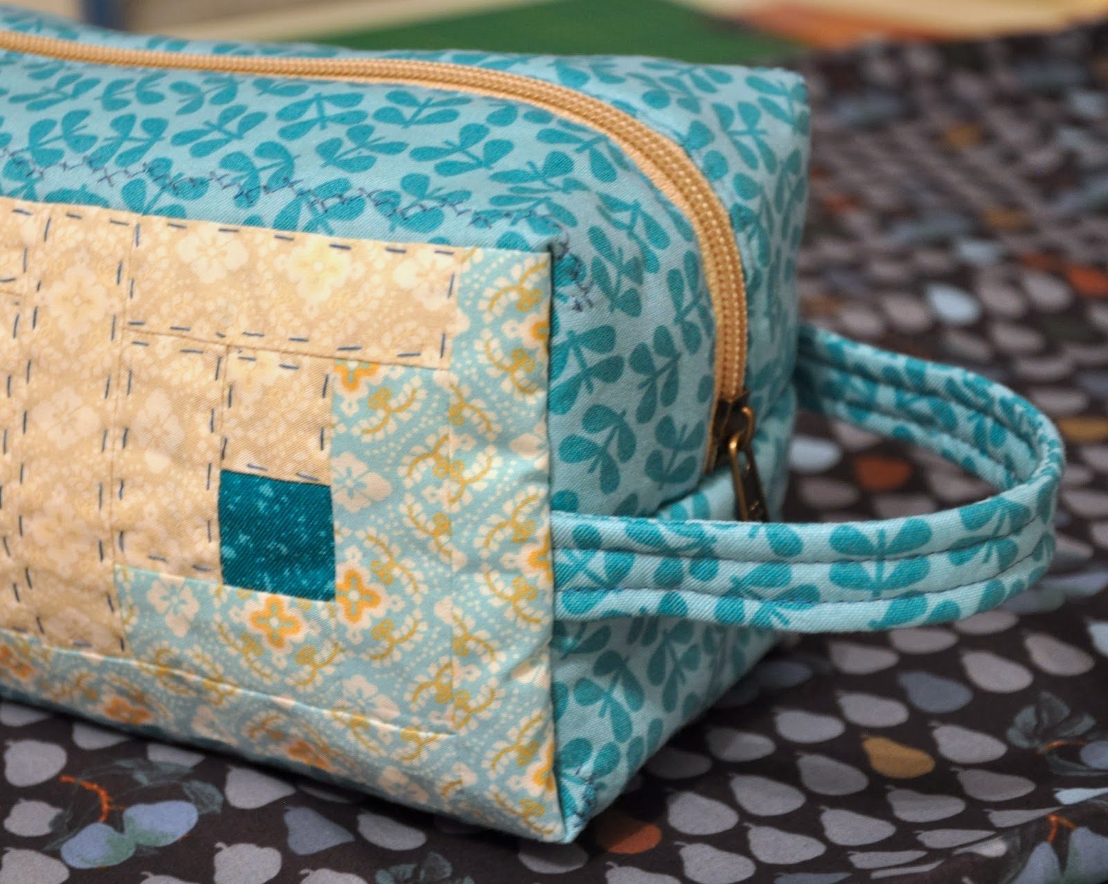 Primeiro, na aula de Patchwork, continuei a minha necessaire. Colocamos o zíper, a alça e o fundo, além de fechar a peça. Dei os últimos acertos em casa na parte de acabamento interno com viés e ficou linda!