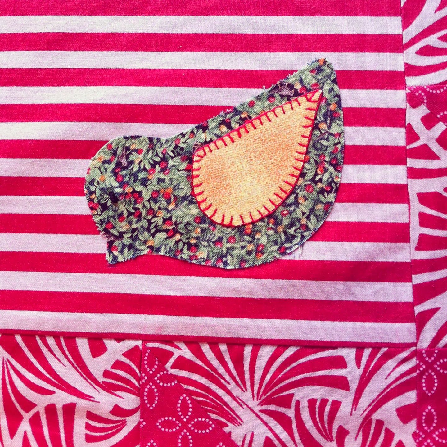 Detalhe do quilt à mão em volta do passarinho e do quadrado listrado.