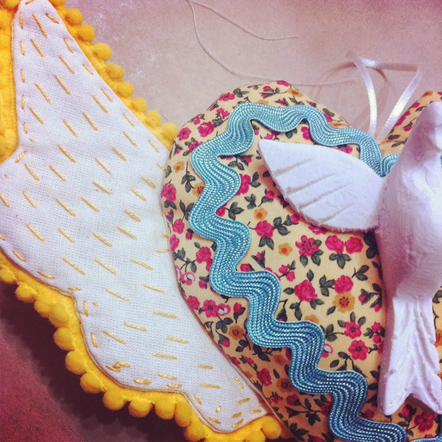 Recebemos as asas já feitas, mas cada uma decorou à sua maneira. O meu coração foi revestido de um tecido amarelo florido e cianinha grande verde-água. Na pontinha de baixo do coração, fitas coloridas deixaram a peça ainda mais fofa!