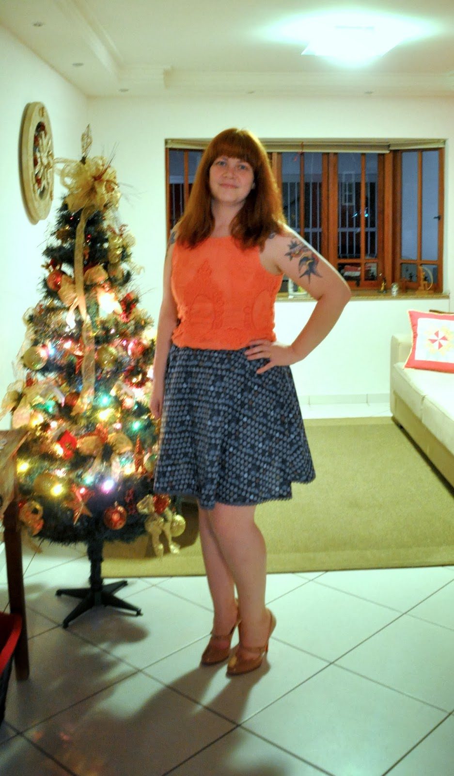 À noite, quando a família chegou para uma pizza e um bolinho, lá estava eu com a saia, uma blusa que eu adoro (gosto muito da combinação de azul com laranja) e sapato novo (super master presente do marido que ganhei adiantado).