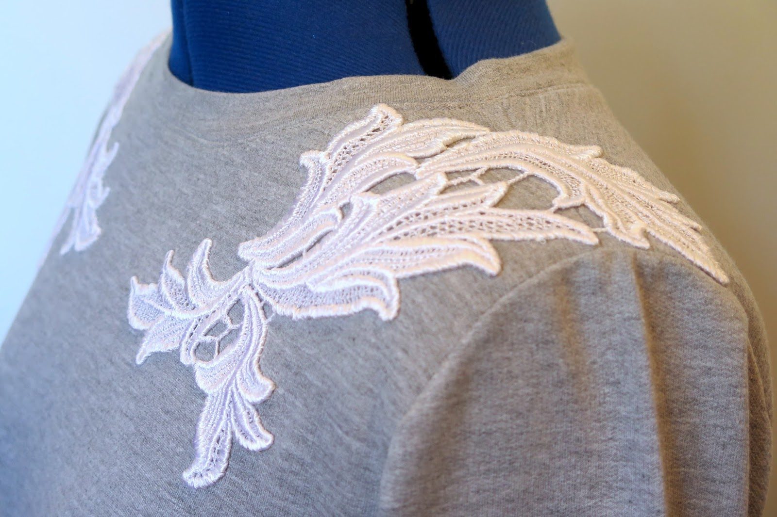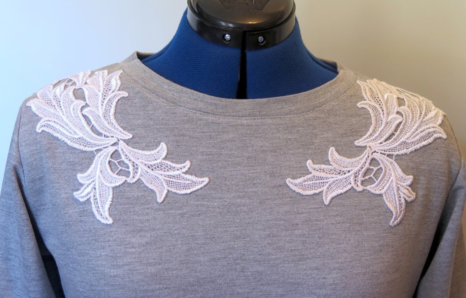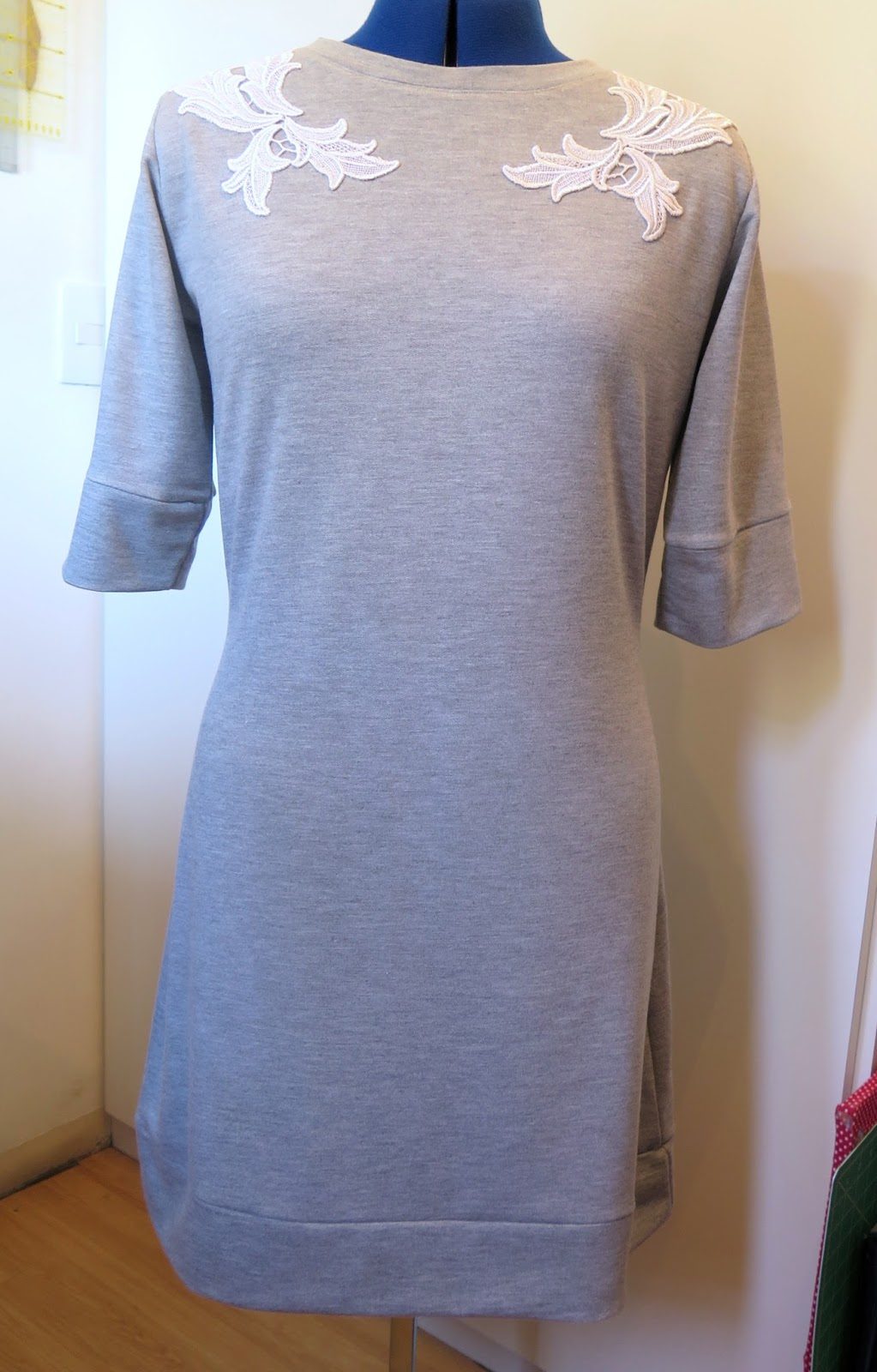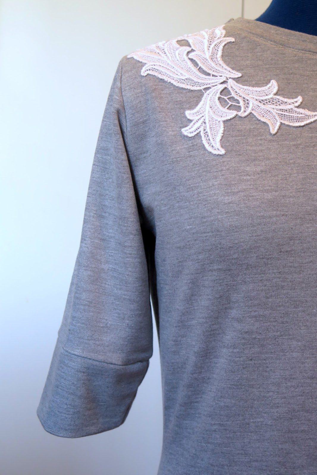 O vestido com nesgas que cortei dia desses ficou parado na última semana, por um bom motivo: aproveitei uma folga na 6a feira, que aconteceu em cima da hora, para fazer um vestido de moletom cinza mescla, aproveitando a empolgação recente com a costura de malhas para o inverno. Para dar um toque especial nesta peça bem básica, coloquei rendas na região dos ombros: