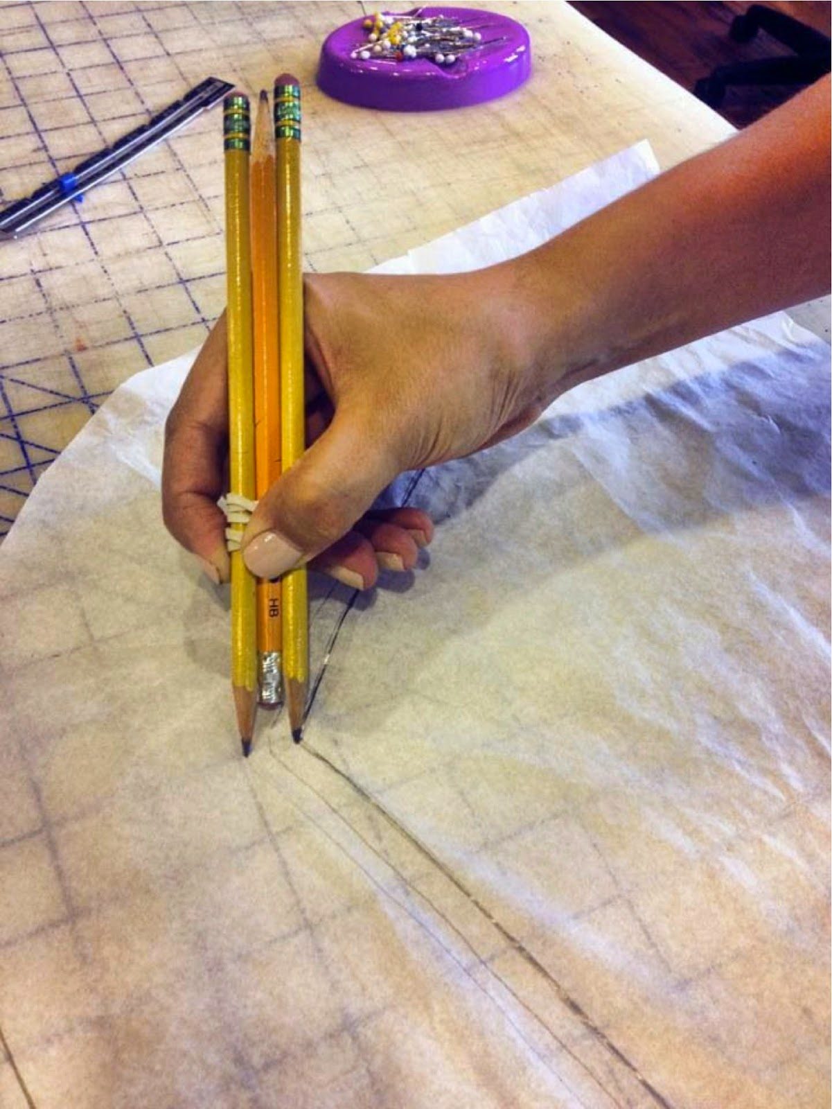 Liguei para minha madrinha, para agradecer e pedir algumas instruções básicas. Comecei tirando o molde da blusa que ganhei em papel. Segundo minha Madras, no caso de blusas em malha, não precisa colocar margem de costura pois o tecido estica e dá certo… Então só precisa adicionar as margens da barra, da manga, da gola e pronto!