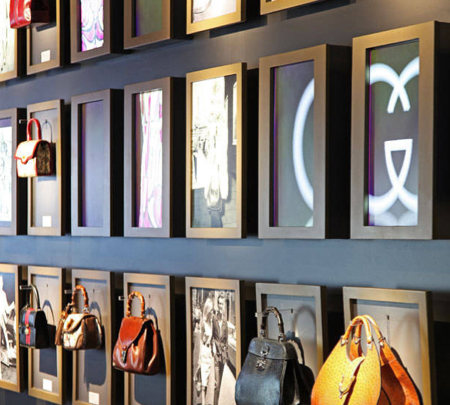 Para quem gosta de acessórios, uma grande parede com modelos como a Jackie Bag (que ganhou esse nome por ter ficado famosa depois que Jackie Kennedy apareceu usando), outros modelos que mesmo sendo de décadas passadas permanecem atuais e também peças desenhadas com inspiração na equitação.