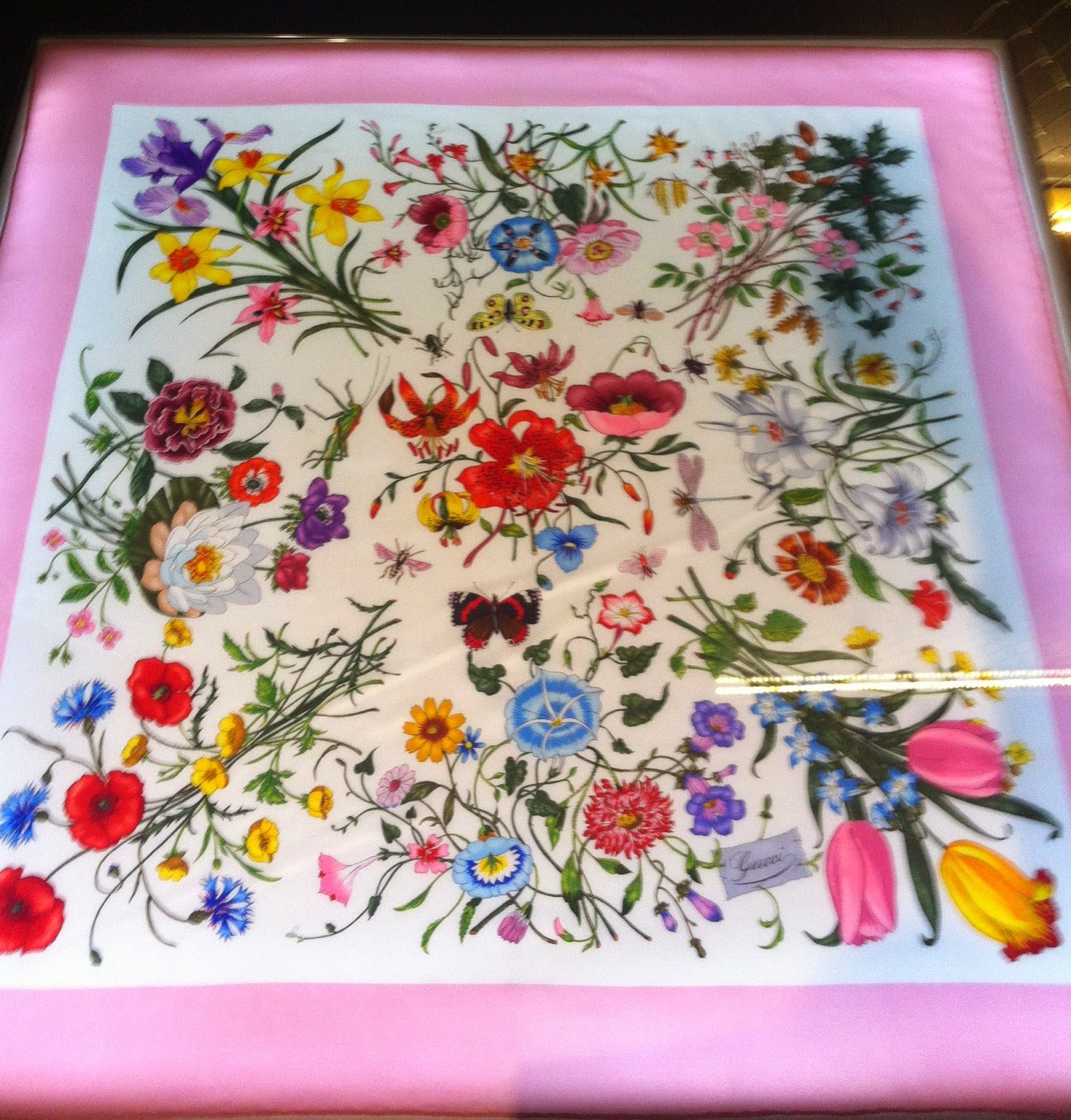 Mas tenho que dizer que, apaixonada por estampas e flores como eu sou, meu coração bateu mais forte pela estampa Flora, criada nos anos 60 para estampar um lenço que foi dado à Grace Kelly e depois reeditado em outras cores e também em uma das coleções mais recentes da Gucci. Foi inspiração também para criar um perfume com o mesmo nome.