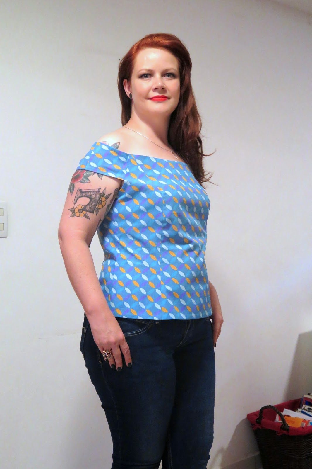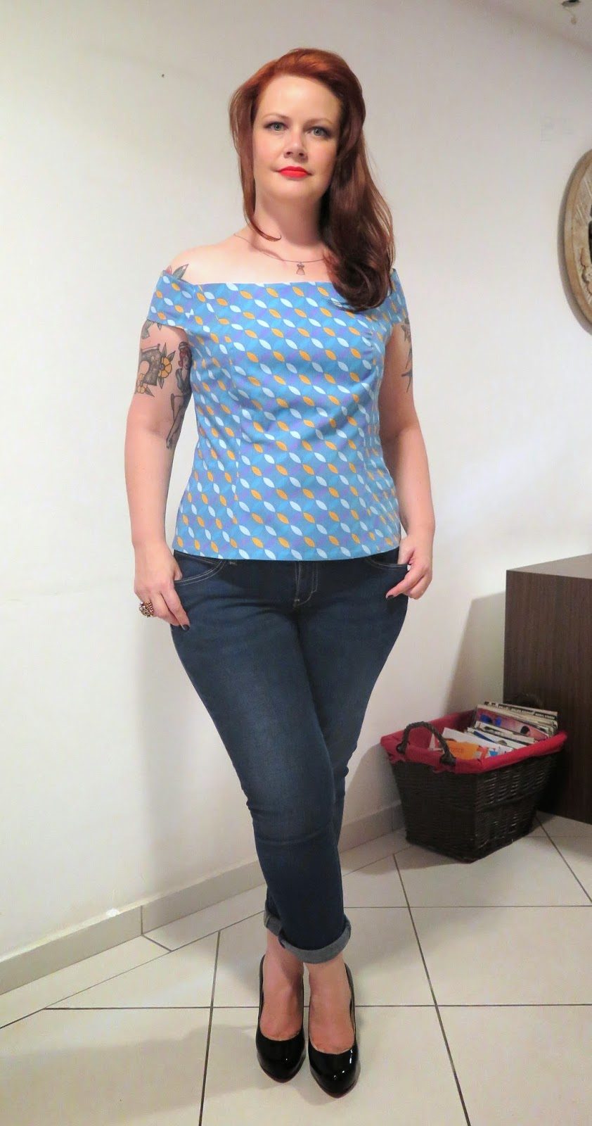 Aí que eu vou terminando a blusa e pensando com o que vou combiná-la. Pensei num shorts jeans para um passeio diurno, numa saia plissada para ficar bem “mocinha” e… com calça jeans! Pois bem, faz tempo que eu não usava calça jeans (já contei em outros posts que não são as peças mais usadas do meu armário). Mas agora que as duas que eu tenho me servem direitinho, estou com vontade de voltar a usá-las.