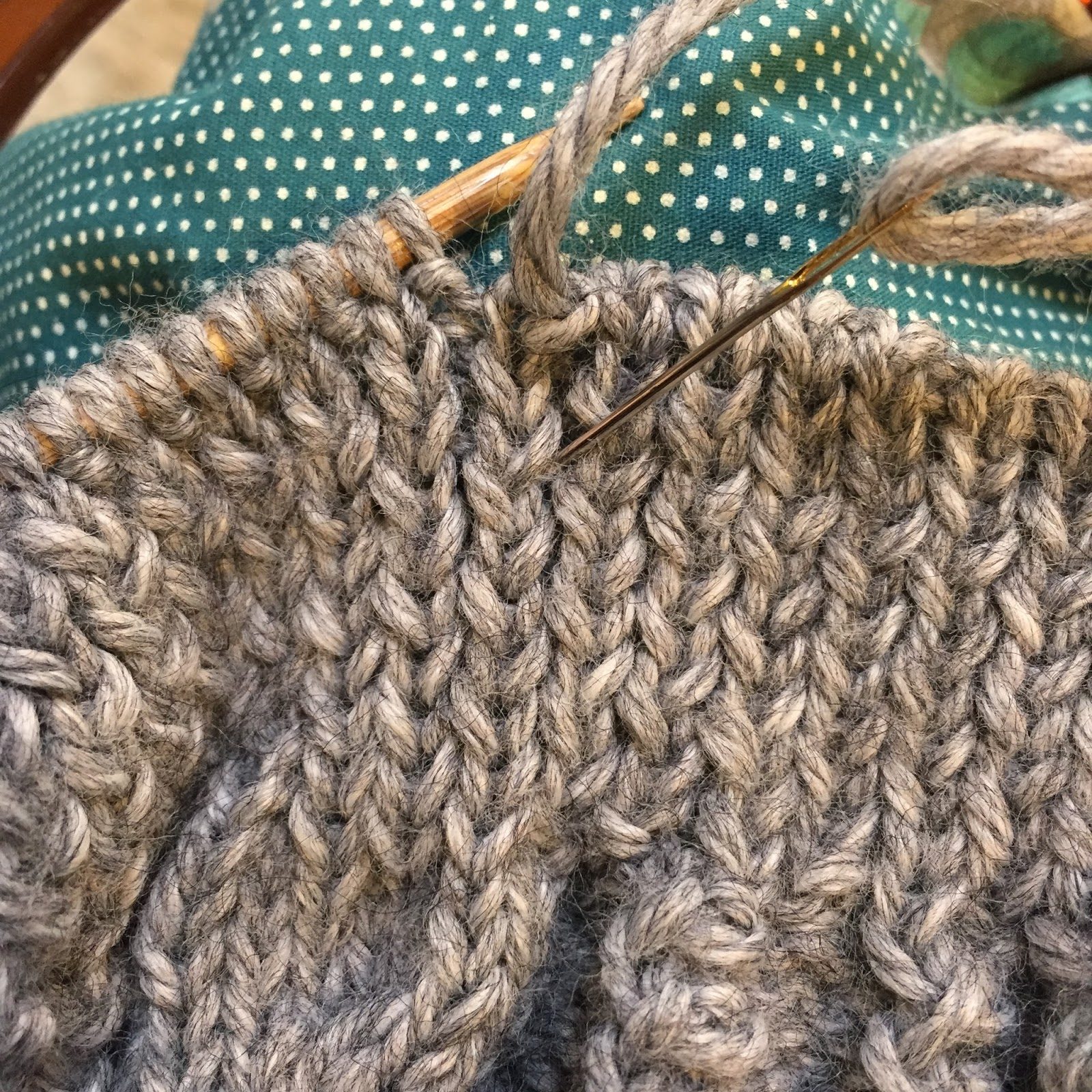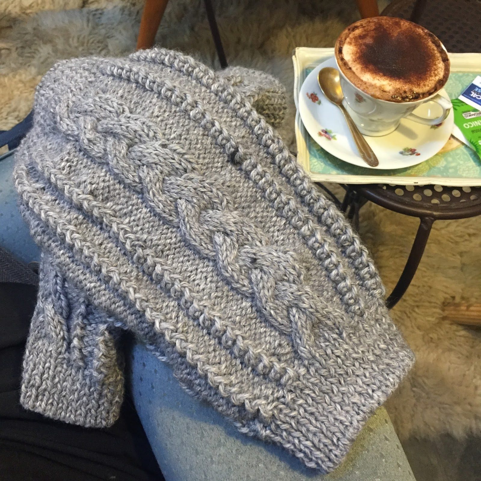 Usei quase dois novelos de lã Amancay (50% Lã, 50% Acrílico, cor cinza), agulhas 4mm para as barras, agulha 5mm para o corpo e agulha média para trançar. O arremate da barra e o fechamento da peça foram feitos com agulha de costura e a própria lã.