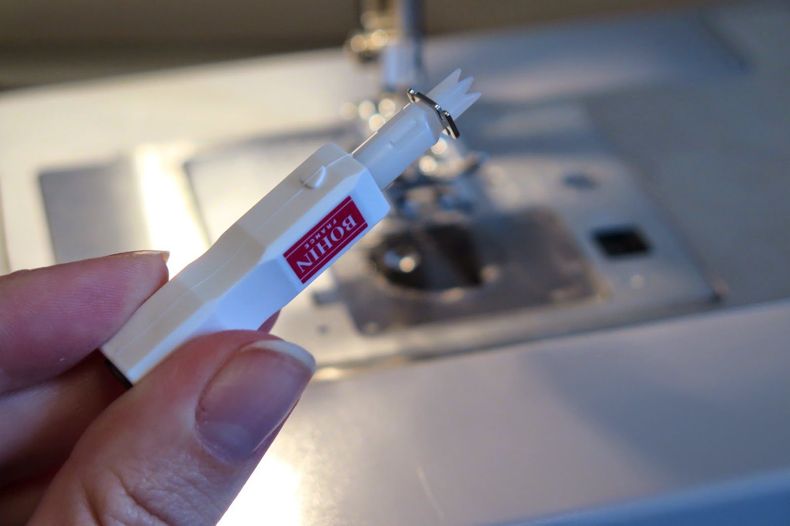 – Sobre encher bobinas e fazer a passagem das linhas na máquina, continua tudo ok. A única coisa é que a máquina tem aquele passador automático de linha na agulha e (não sei como) eu entortei um ferrinho bem fininho. Agora o passador não funciona mais, pois o ferrinho que entortou é exatamente o que entra no buraquinho da agulha levando a linha através dele… Já tentei desentortar mas não consegui. Como eu não quis levar numa assistência só por conta disso, eu comprei numa viagem no ano passado um passador avulso de linha adequado para usar em máquina de costura, da Bohin. Ele tem resolvido bem, ou vai no jeito tradicional mesmo (ou seja, passando a linha “na mão”).