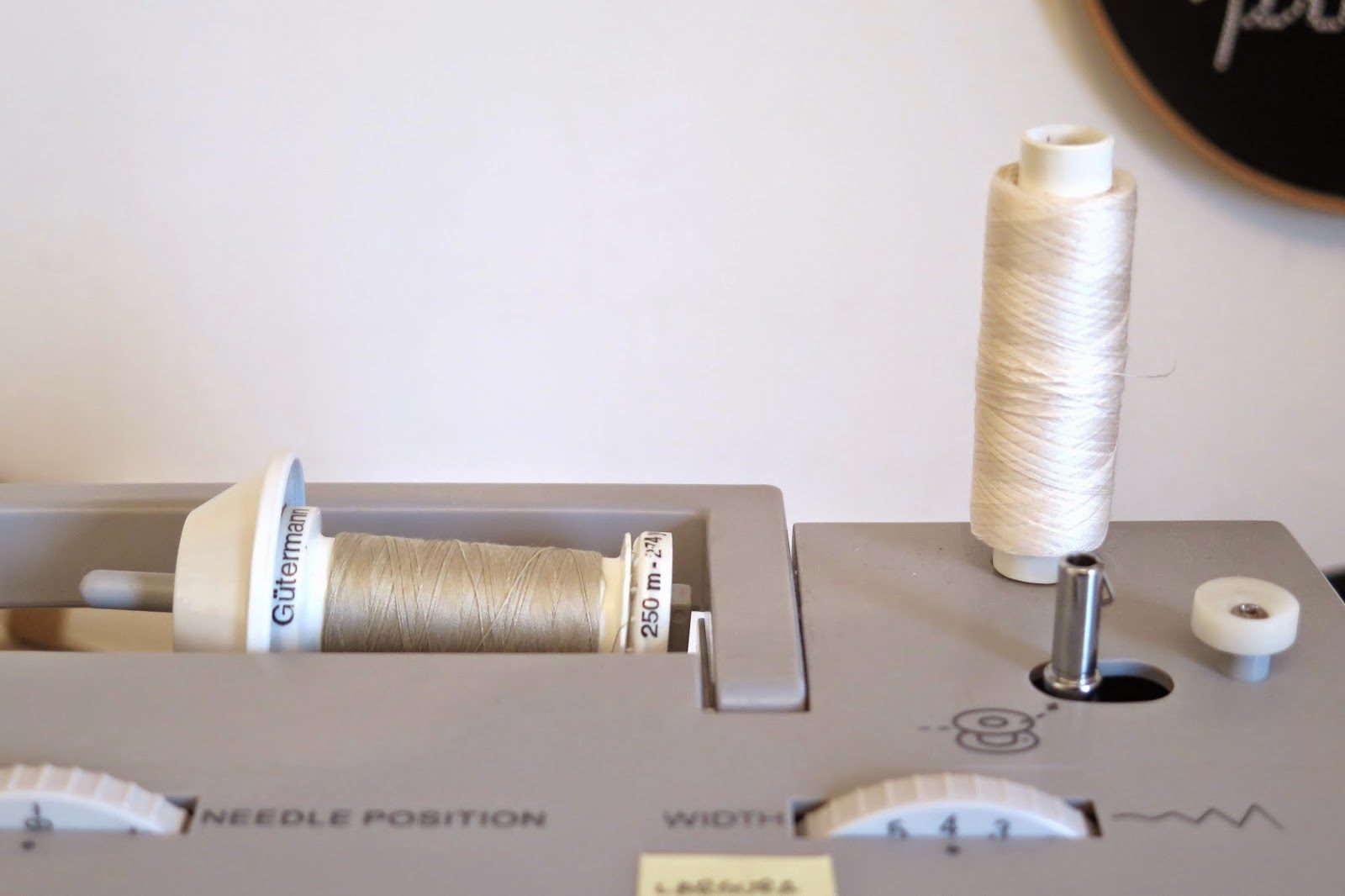 – Sobre o uso de linhas, permanece quase tudo igual. Para cones grandes eu deixo atrás da máquina e passo a linha em um ganchinho preso em uma prateleira logo acima da máquina (truque neste post). O pino inclinado que fica no centro da parte de cima da máquina eu uso apenas em conjunto com o cone grande ou com o pino removível (quando é um retrós pequeno de linha) quando uso agulha dupla, já que aí é preciso passar duas linhas por cima.